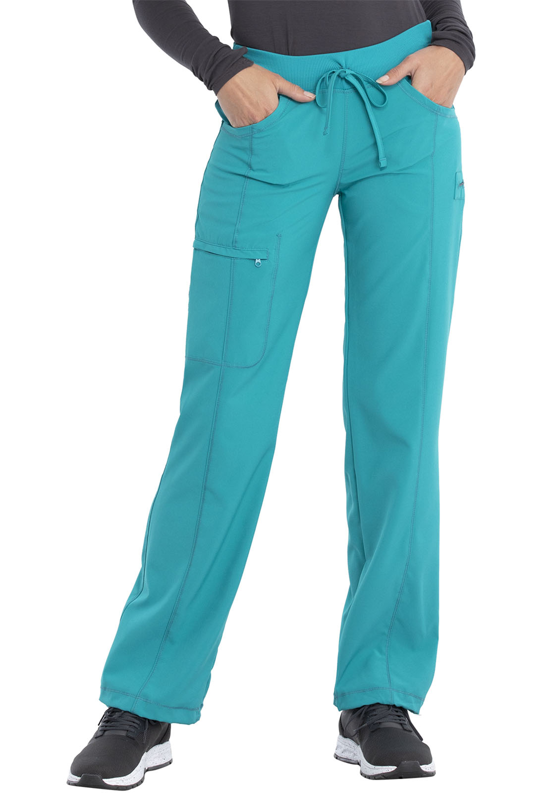 A Contemporary fit, low rise, straight leg pant features an elastic knit waistband and adjustable drawstring. Also featured are rib knit front and back yokes, angled front pockets, front leg seams for detail with a zip closure cargo pocket. One back patch pocket, a bungee instrument loop below left pocket, a bungee cord with a toggle at the leg hems for adjustability with coverstitch detail throughout. Inseam: 28 1/2". The comfortable stretch poplin fabric and super stretchy rib knit is the perfect combo for healthcare professionals.